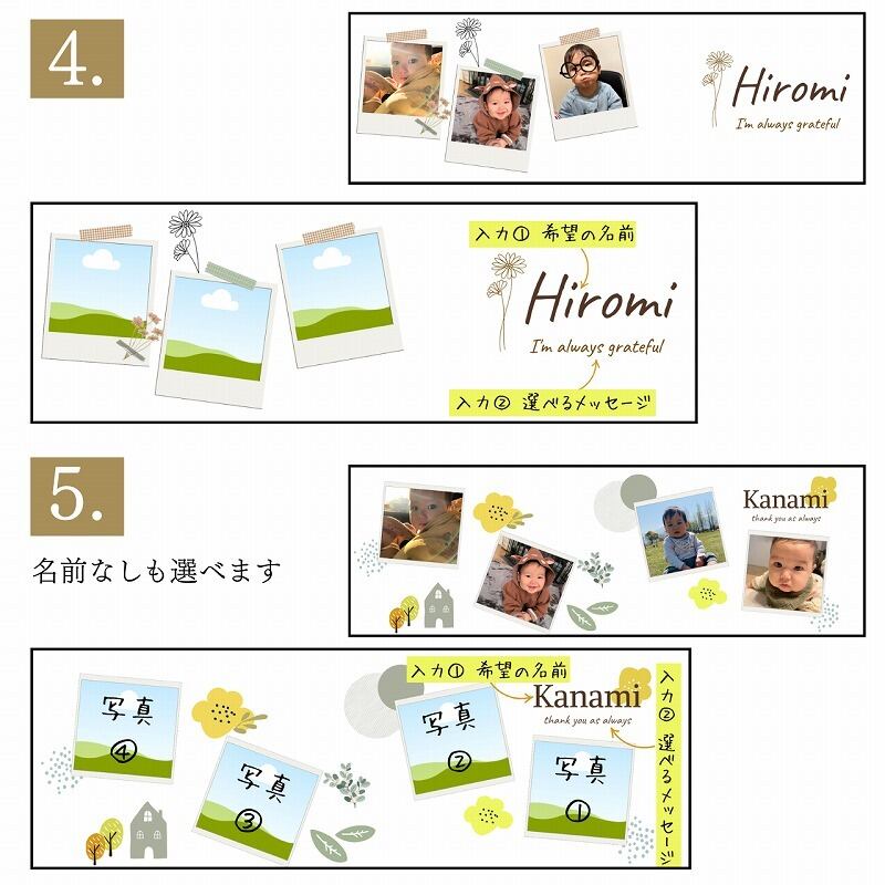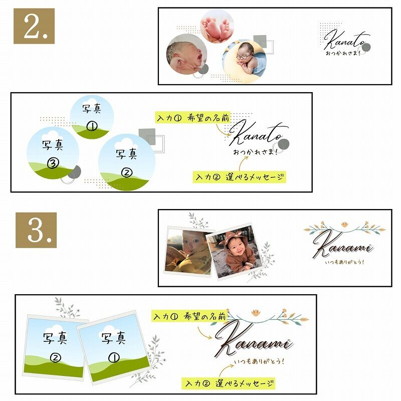 デザインに応じた写真枚数と、文字入れありの場合はテンプレートからお選びください。
